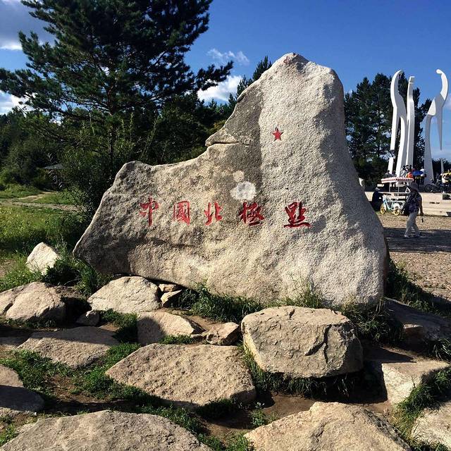 沿着形态各异的“北”字,我们终于走到了我国最北端的广场——北望垭口。“东经122°20'43.48〃E北纬53°29'52.28〃N”的标志就立在这里,旁边一块巨石上刻着“中国北极点”。