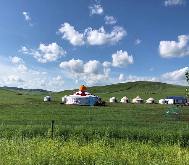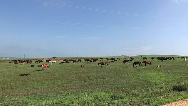 此时的草原空气湿润而干净,偶尔会传来马匹的几声嘶鸣;草地里虫鸣声声,却看不到虫儿的影子。开阔平缓的大地上,没有高楼,没有工厂,没有商铺,没有喧器,有的只是点缀在绿色海洋中的几座乳白色的蒙古包。