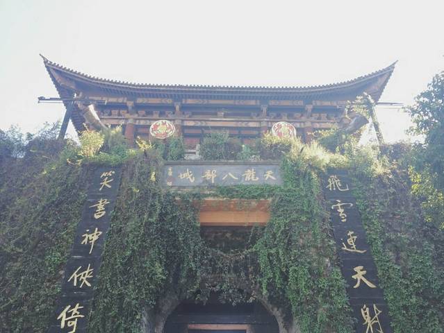 景区门口依旧有装扮的古代门卫在把守,也就是入口处了,过了入口处便是一条吐水的石龙张牙舞爪,整体建筑包含了城墙、城门、皇宫、王府、大理街等。在《天龙八部》中描写的聚贤庄、信阳城马夫人家,无量山石洞房,以及木,铁古桥及客寨配套项目也都是一应俱全。