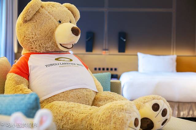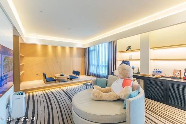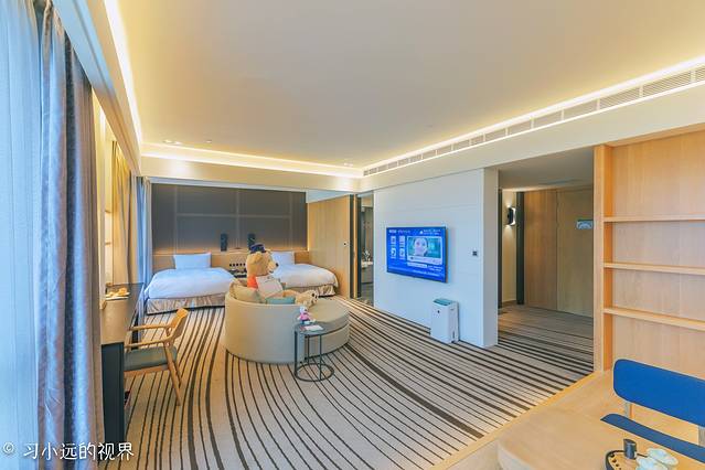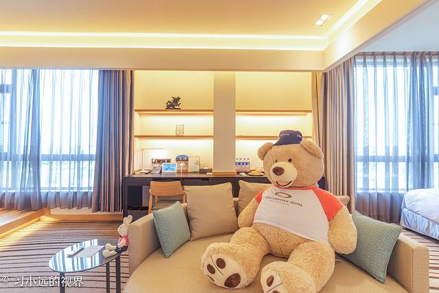 标间的房间,进门衣帽间和行李放置处,在进个套间,可以席地而坐泡茶静坐。放置在室内中间的是一个圆形沙发,沙发上摆放着一只超级醒目吸睛的大熊,对于这样的大娃娃虽然是男孩子不过看着大熊的造型也是颇为喜欢,是房间内部陈列的一大亮点。旁边是书桌和吧台,最里面就是舒适柔软的两张床。