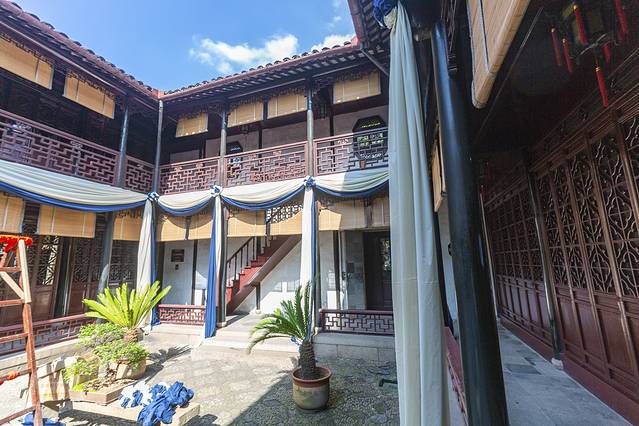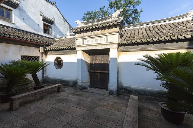 崇本堂也被辟做 江南 水乡婚俗馆,在这里又多了很多喜 庆元 素。本堂最吸引人的,是它园中的各种雕刻。在庭院,砖雕门楼面北伫立,门楼上方设置了仿木结构的飞椽斗拱,下面是花岗岩制作的条 石门 槛。门楼的字牌两侧各有一幅人物山水画,字牌上端庄有力地写着“崇德思本”四个朋字。德乃世人安身立命之根本,亦是宅第主人崇尚的为人之道。