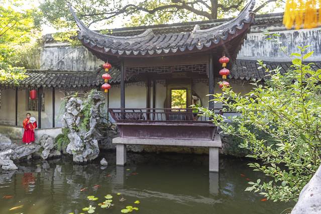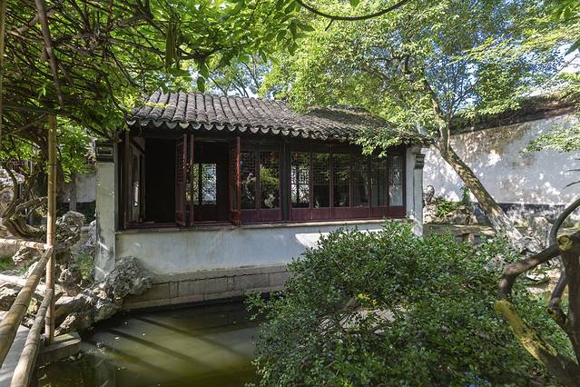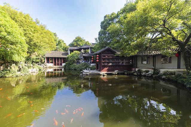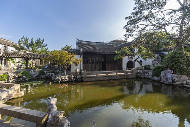 后花园由荷花池为中心,上架三曲桥,池周假山高低错落,参差有致。三友亭、曲廊、鸳鸯厅、燕翼楼、古松轩、环秀阁和墨香阁围池建之。