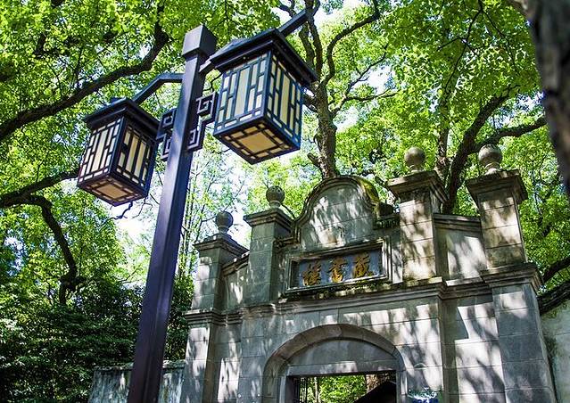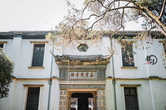 曲水流觞,花木扶疏,藏书楼掩映在参天古树中,白墙黑瓦,格外古朴。门楼上的“嘉业藏书楼”五个大字是由书法家刘廷琛所题。