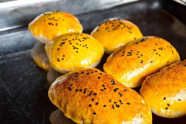 南浔特产蟹黄香酥饼,有着蟹壳黄的外表,金灿灿的表皮点上几颗芝麻,有三种馅料:豆沙、肉松、梅干菜。