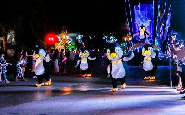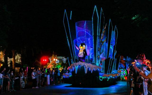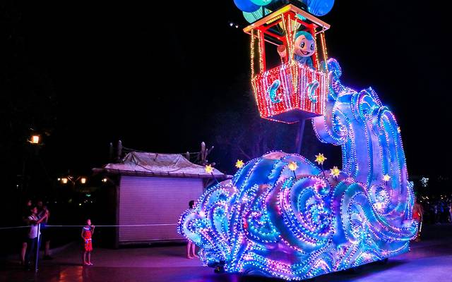 待到晚上,大巡游19:15分便会准时开始,伴着欢快的音乐声,缤纷绚烂的花灯车队整齐地缓缓走过;
