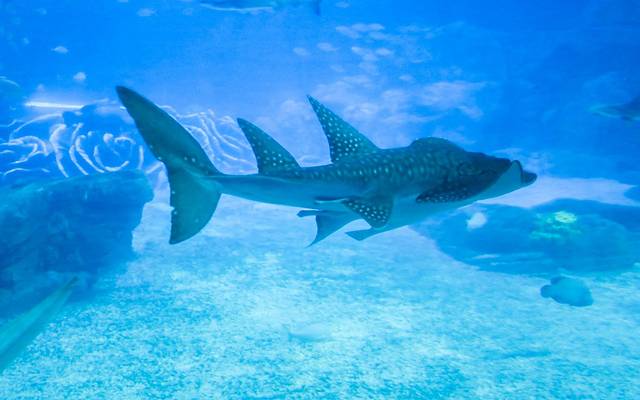 穿过头顶是魔鬼鱼造型的穹顶的海洋大街,第一眼望见的就是那座矗立在海洋馆之上的鲸鲨雕像,高达六十三米,约十八层高。远远望去,仿若一条真的鲸鲨正无声地向天空跃起。