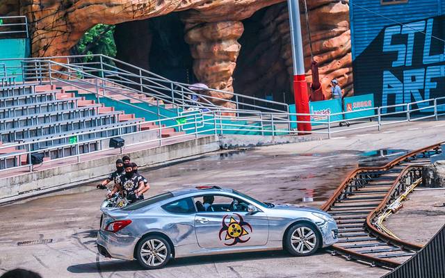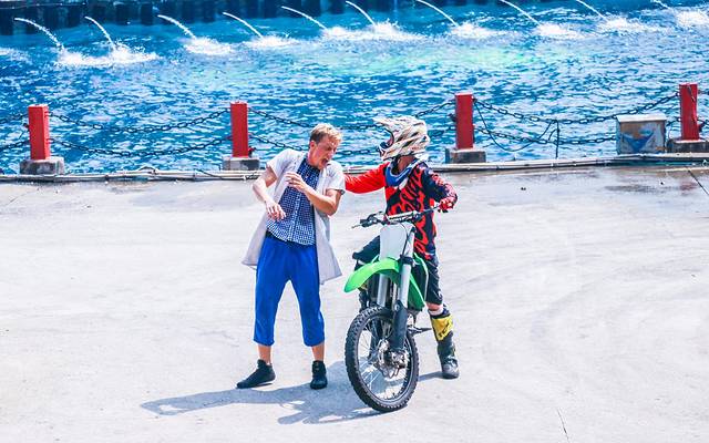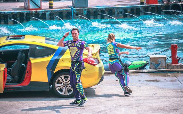 吃完午饭前往国际特技剧场。据说这里是世界上最大的特技表演场,全新实景特技表演《惊爆危机岛2》已震撼登场,该大片无论剧情、特技、道具皆全新推出,枪战、烟火、声光、滑水、高空特技等多种特效,令人不断喝彩;