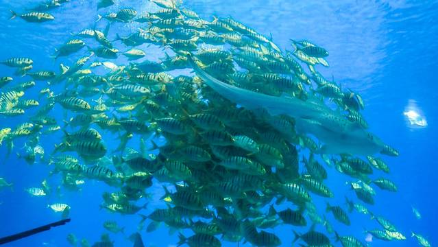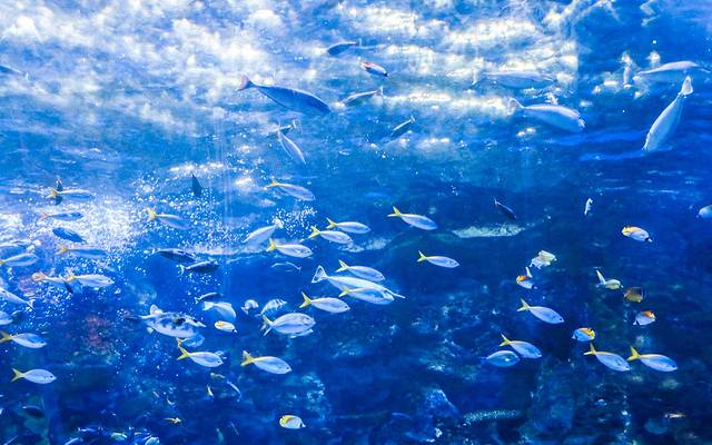 鲸鲨馆的弧形水下长廊内,仿佛身处360度无死角海洋世界,可以看到成千上万的珍稀鱼类在身边游曳,成群结队浩浩荡荡地从壁旁游过;五光十色的圆形穹顶折射出美丽的光线,带来非常独特的游览体验;偶尔巨型鲸鲨带着磅礴的气势悠哉而来,俨然是这片水域的王者~