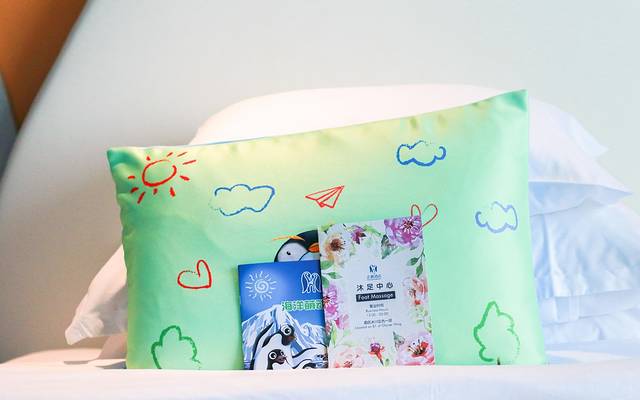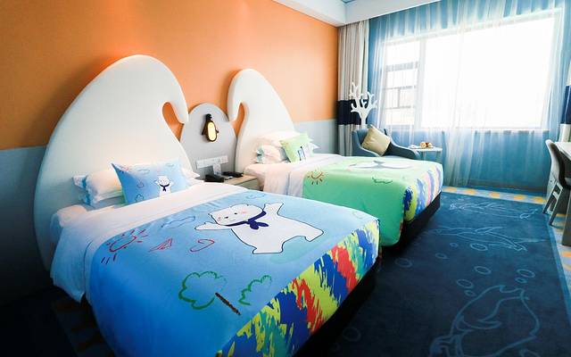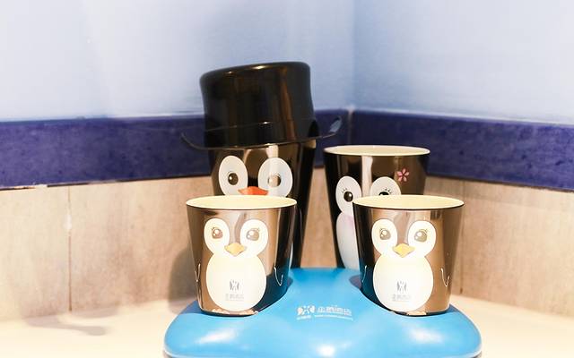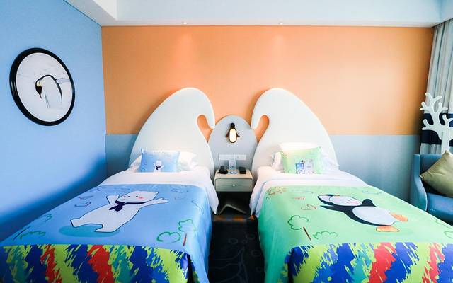 企鹅酒店主题套房,有着让人身临其境的卡通浪漫布置,细节的布置却很用心,蓝色调的房间装饰,各种企鹅元素层出不穷,水杯,毛巾,钥匙扣上都印有企鹅的萌萌身影;就连床榻上的被单都是不同形态的企鹅;
