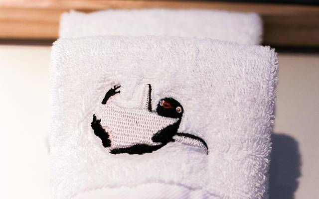 浴巾流露出一只可爱的企鹅角标,看得我们心情一下子就灿烂起来。