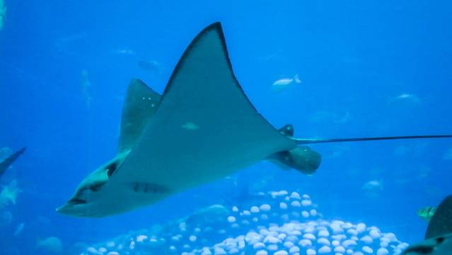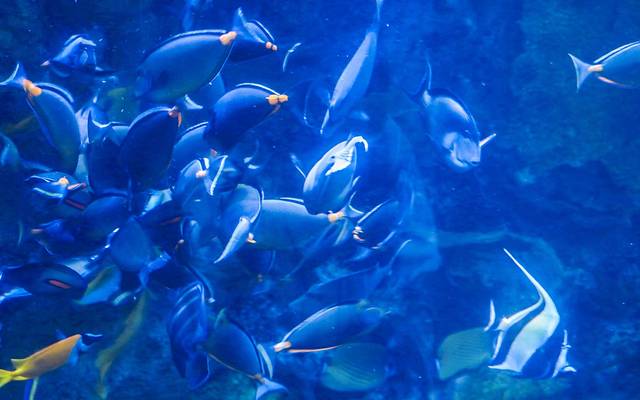继续往前能看到各种可爱爆棚的海洋生物,居于一片幽蓝的水光中的花园鳗与刀片鱼,这些可爱的鳗鱼将自身埋在沙子中,只留下上半身在水中捕食、呼吸,不仔细看还以为是海草在水中偶尔舞动~