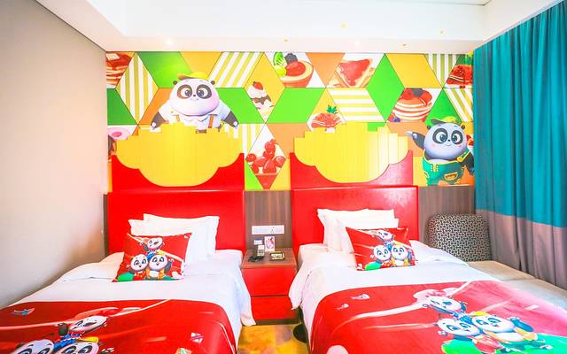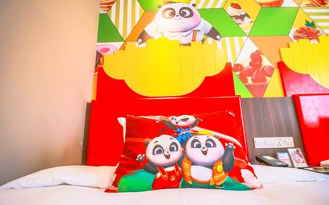 一路走到客房,推门而进又是一场惊喜,床上和墙壁及天花板都是充满卡通角色的熊猫的元素,酒店内的设施从里到外风格都非常统一,各具特色的客房设计营造出活力童趣的氛围,更是生动还原卡通片内的角色和故事~