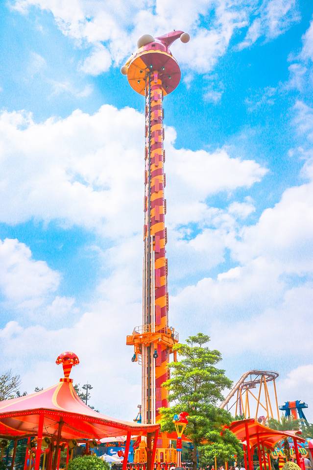 位于欢乐世界最中心的“金箍棒”自由落体,从65米的高空360°全方位欣赏全园美景,惊叹高空俯视的壮观之际的同时过山车突然停下,瞬间垂直跌落,听起来似乎有些可怕,但是真正上去尝试的时候还是挺爽的~