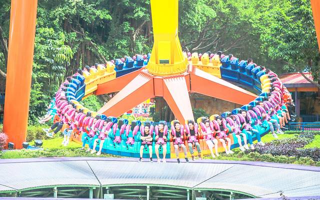超级大摆锤,号称“全球最大大摆锤”,也是长隆欢乐世界最震撼人心的尖叫声最多的项目;坐上去只一会, 就被大锤子拉扯的到处乱飞,由高到底,摇一次高一点,在天旋地转之间,让你目炫神迷,惊心动魄!刚停下的刹那,是否能感受到自己的砰砰心跳,好像整个人要被丢出去的感觉;从大摆锤上下来居然莫名有种劫后余生的感觉。