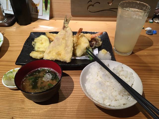 我们到那儿已经是晚上8点多了,房东为我们介绍了一番之后,我们就出门觅食,来到房东推荐的餐馆【波平NAMIHEI】。传统的日式餐馆,有 关东 煮和各种盖饭套餐,也有卖江之岛有名的小银鱼盖饭,我们没敢挑战生的小银鱼盖饭,就点了普通的炸鸡和天妇罗盖饭,非常好吃!