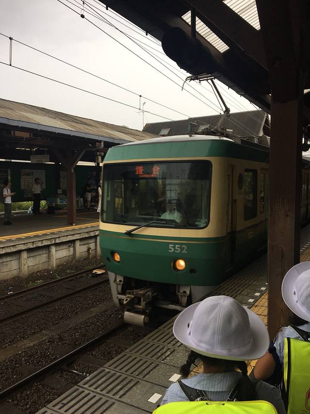 在江之岛站等车的时候有许多放了学的小朋友,穿着制服带着帽子,很可爱。