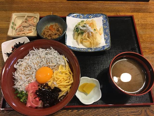 看完水族馆,我们在附近的餐厅吃了中饭,来都来了还是要尝一下当地特色的小银鱼盖饭的,但没敢挑战生的,选择了熟的小银鱼盖饭,生的话就是しらす丼,熟的是釜揚げ丼。熟的一点都不腥,生鸡蛋也不会腥,没有什么味道,比较清淡。