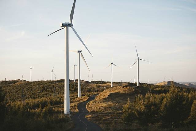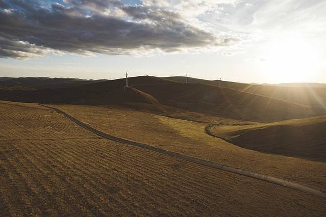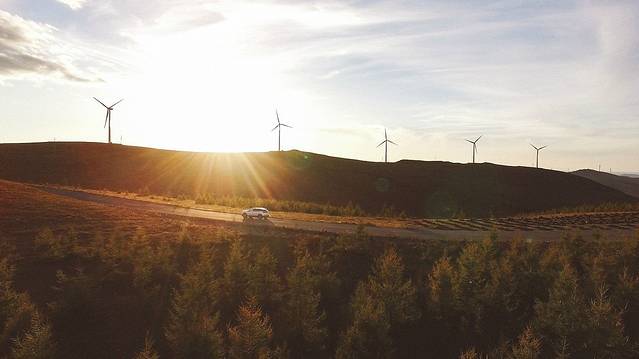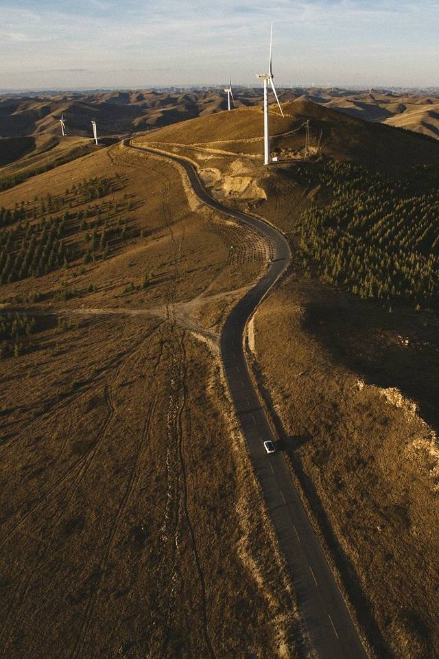 俯眼望去大片金黄的梯田,公路两旁是排排的风力发电风车,这便成了一道靓丽的风景。