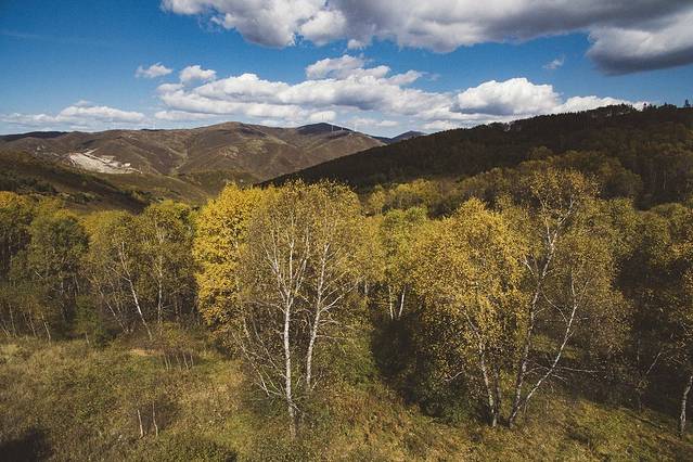 沿途中路过一片白桦林,停下来拍拍照,白桦树褪去了盛夏的绿色,披上了金黄的外衣,阳光下格外的耀眼,真的很美。秋景不易且短暂,只要是下过一场秋雨,一夜间起了秋风,一夜醒来便是满地金黄。