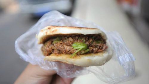 这里的肉夹馍5.5元一个,价格比较亲民。大口咬下去,肉感厚,青椒香,伴着浓郁的肉加香菜和青椒的混合香倍感味儿足。