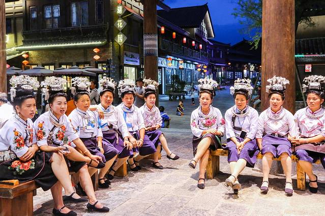 下午在鼓楼广场航拍的时候就碰到了这群穿着民族服饰的苗家美女们从前一个广场过来,众多表演者浩浩荡荡走来,很有气势。甩手舞也很欢乐,不少的游客都跟着跳。在鼓楼广场跳完之后,还会去到下一个广场。