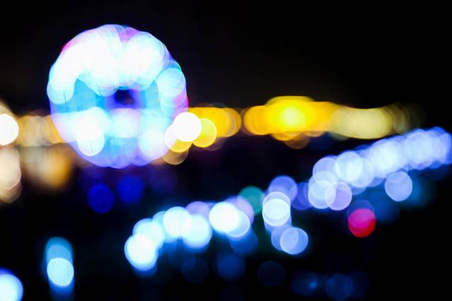 通往湖边栈道的彩灯无颜色流,在这黑色里添了一丝浪漫。