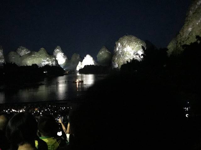下午5点半在酒店骑电动车去印象刘三姐景区,人山人海啊,电动车都没有地方停,景区门口有卖鸡蛋灌饼儿的,13块钱一个,好吧,大北京才4块钱一个……现切水果20元一盒,买了一盒,坐好了位置赶紧吃。