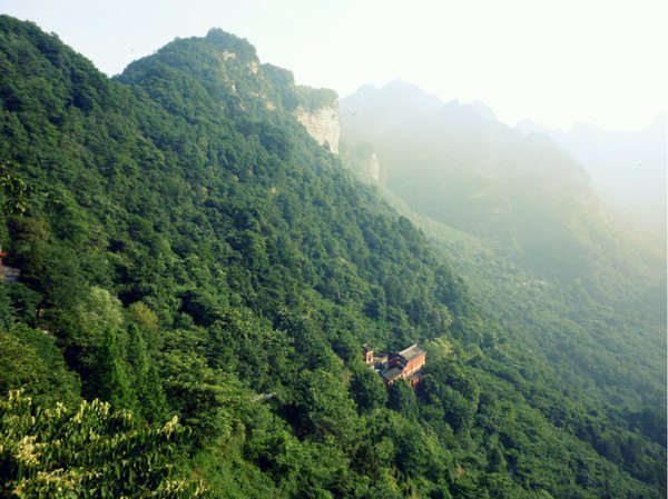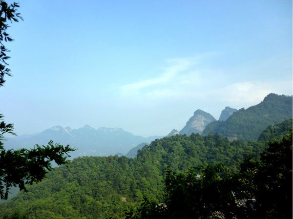 景区观光巴士在山间蜿蜒直上,远处的溪流在山的怀抱里,形如滚珠,俏皮地跳跃着,给敦厚的武当带来一丝灵逸。山势在这里风貌迥异,时而山梁,时而沟壑,坡随山转,层峦叠嶂。压抑住面对大自然险象的忐忑,大胆放眼望去,下面是深深的峡谷,寂静而荒僻,抬头望是耸立的高山,巍峨而缭绕。在无数的转向之后,云雾包裹着的翠绿就荡漾在眼前……