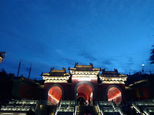 安顿好住处,简单吃过晚饭,便去不远处的玉虚宫转转看。玉虚宫整体采取宫廷建筑规制,以严谨的中轴线对称布局,宫殿重重,飞金流碧,富丽堂皇,于夜色中愈发显得威武、庄严。