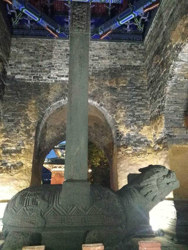 据说玉虚宫有着国内最大的赑屃石刻,借助灯光仔细看看,果然很精美,甲壳、肌肉明显有质感,腿脚有用劲负重之神态,尾卷一盘,呈使劲承受高大的御碑之状。