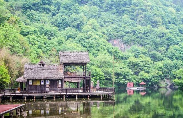 接下来的行程是逍遥谷,逍遥谷是一处天然氧吧,《倚天屠龙记》的取景处就建于此。十月的武当,山色清碧,含烟点翠,水面清澈,远远望去水面小筑的茅草阁楼,一幅远离尘世的清凉画境。