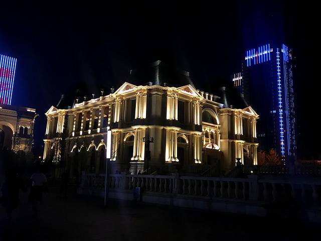 星海广场旁的东方威尼斯水城也是大连不可错过的夜景。水城里有坐游船的项目,我们去时排队的人特别多,所以没有坐。