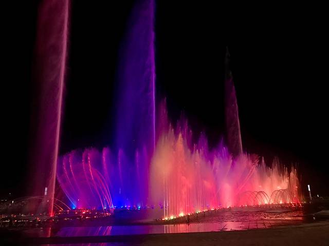 从凯丹广场出来不行五分钟左右就能到东港音乐喷泉广场了。作为大连标志性广场,国庆期间更是吸引了全国各地的游客。音乐广场最不能错过的当然是喷泉表演了。我们赶上7点的表演,持续了大约半个小时。可能是广场为了庆祝国庆的缘故,播放的音乐都与中国元素息息相关。灯光与喷泉在音乐的伴奏下相呼应,形成了一幅幅水木画。广场旁边有小吃街,来玩的朋友不用担心饿肚子。如果逛累了还可以租单车游览广场,十分方便。