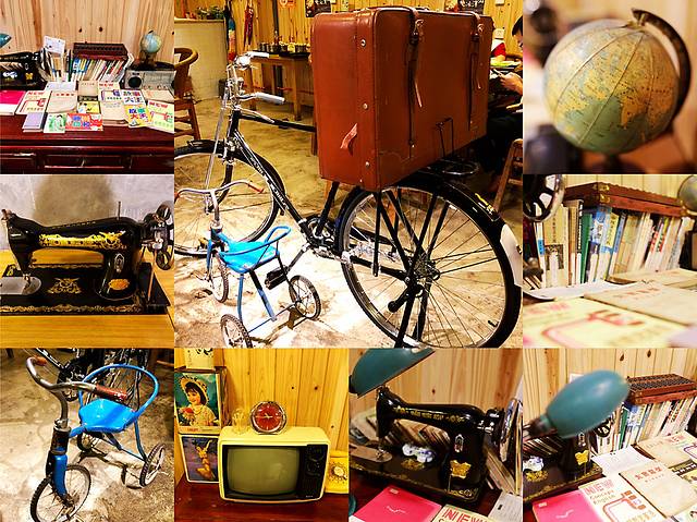 店内布置的这些个老物件,都是一个个可以进博物馆的宝贝咯,28自行车,地球仪,缝纫机,算盘,老式电视机...