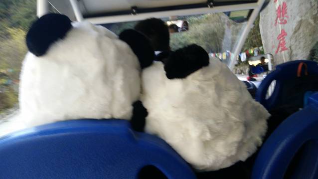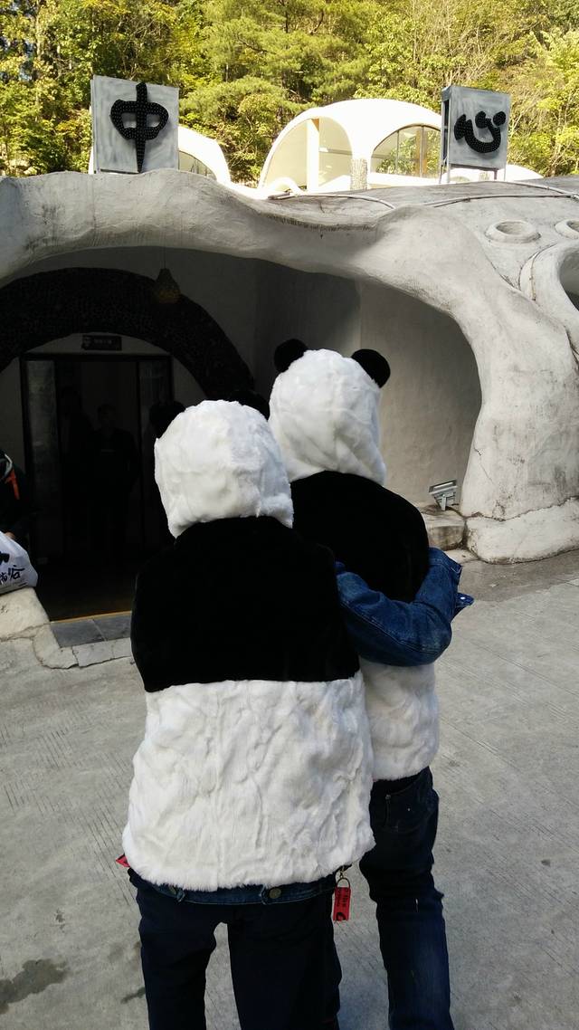 山里的早上还是挺凉的,在景区门口给俩孩子各买了一件熊猫服,怎么样,拉风吧?