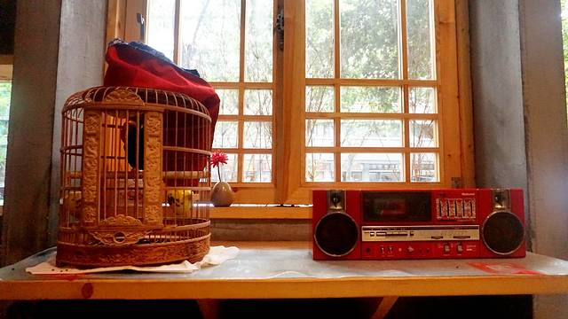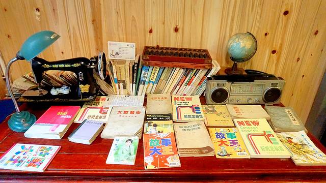 这是一家怀旧版火锅店:老式自行车、手提箱、缝纫机、书籍杂志、磁带等特别有年代感。