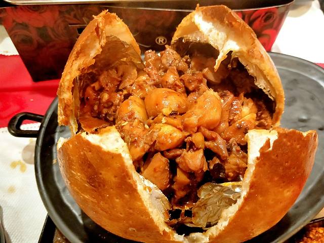 打开香酥的面包壳,浓郁馋人的芋儿鸡香气扑鼻而来,尤其是外面一圈金黄的面包,引的邻桌的朋友都过来拍照。