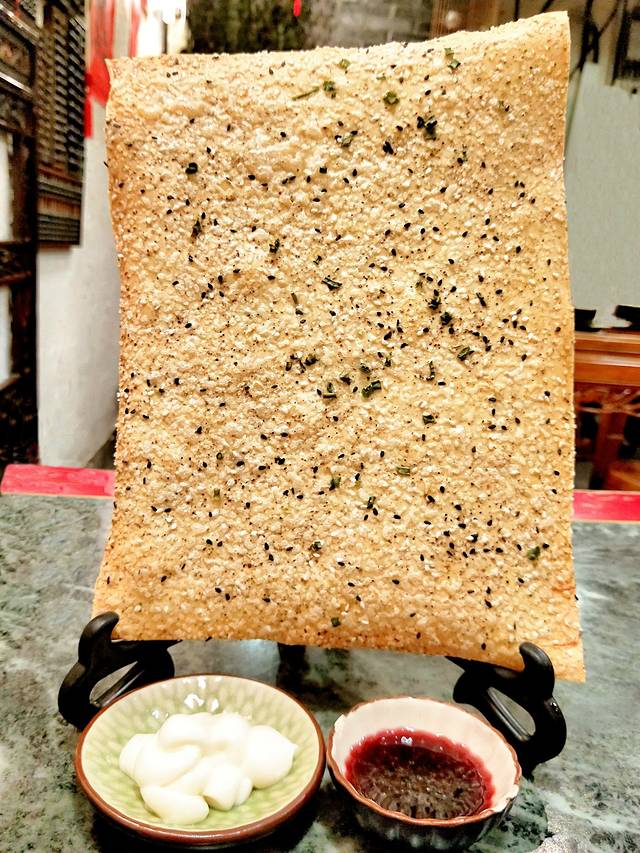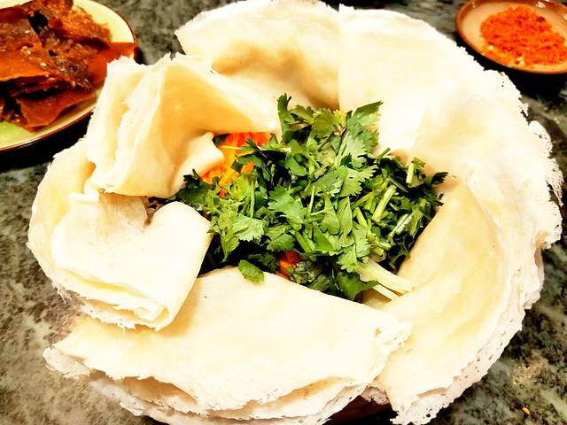 灯影牛肉:薄薄的干片牛肉,切成片裹着面皮,蘸着酱料,恍如吃烤鸭般,独特的牛肉吃法不得不体验。