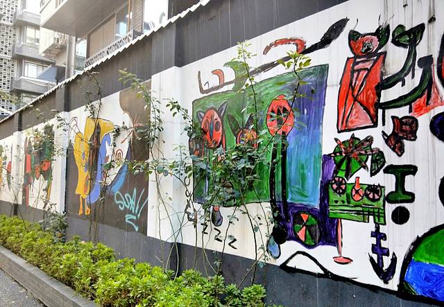 一侧的尽头墙壁上是小朋友的涂绘,色彩鲜明,主题生动,描绘了成都的生活和特色。