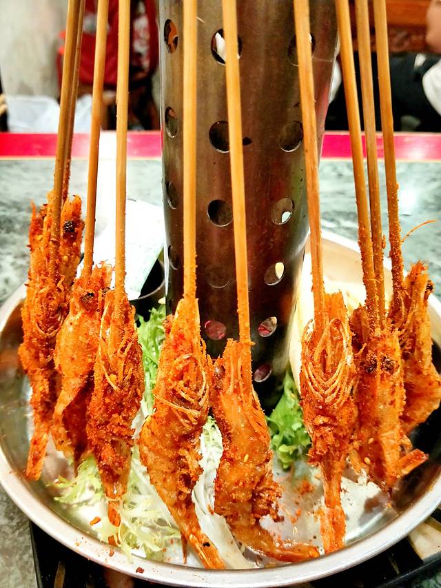 火药虾:香酥,口齿留香,特爱的一道菜。中间的炭火可以使搭配的薯条一直保持常温。