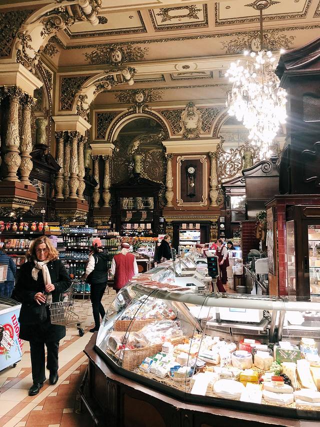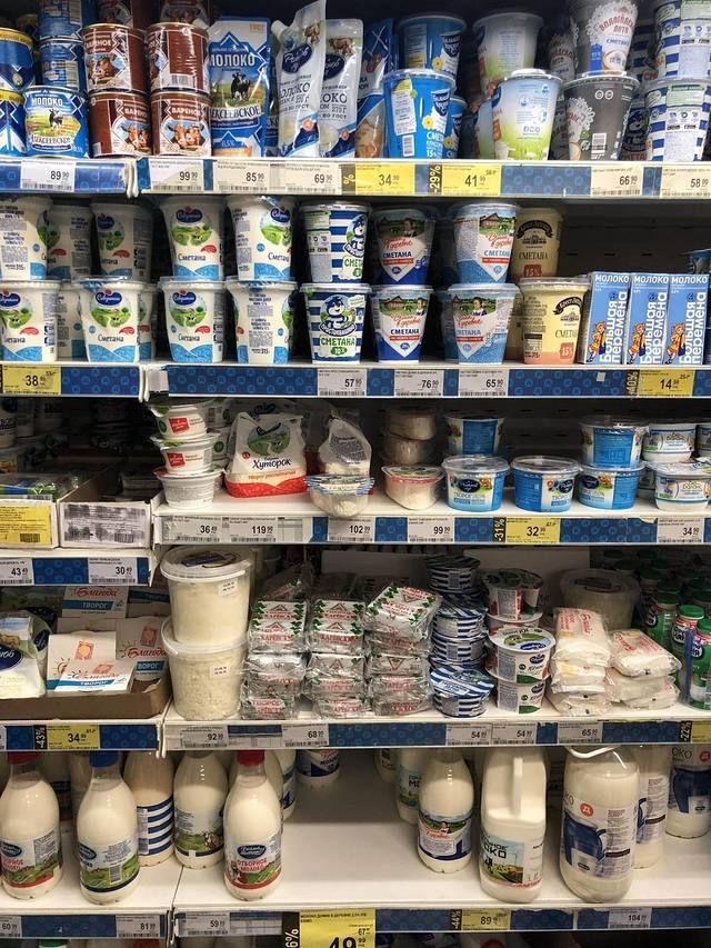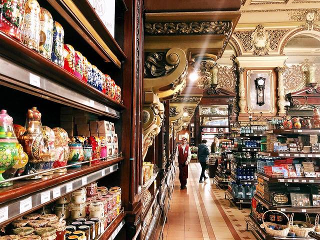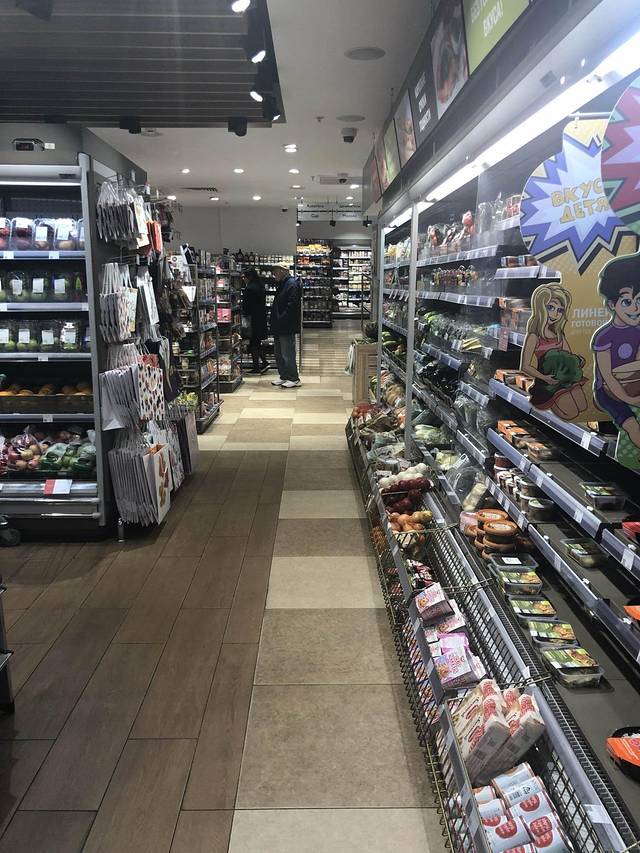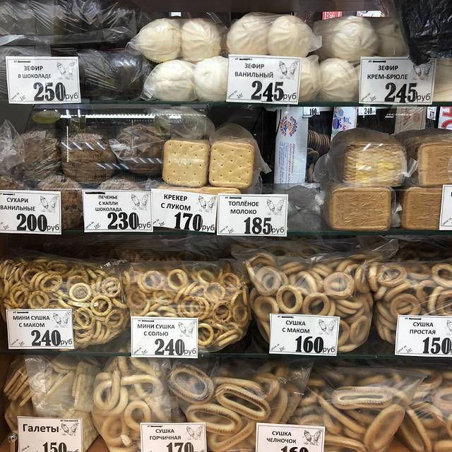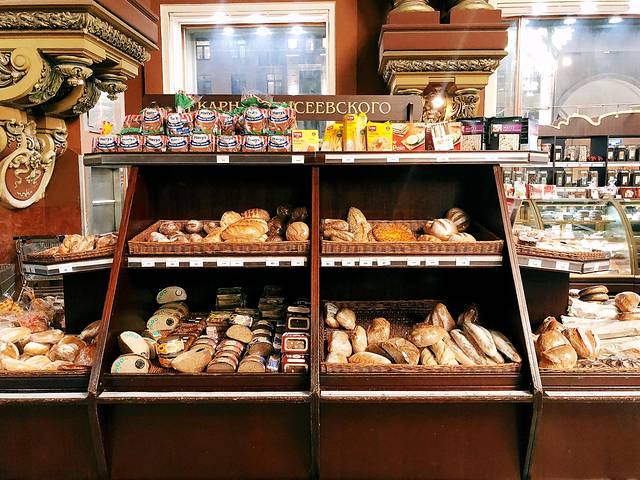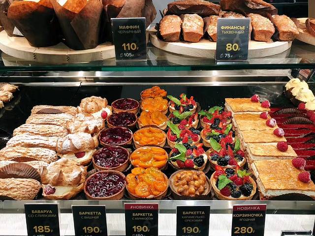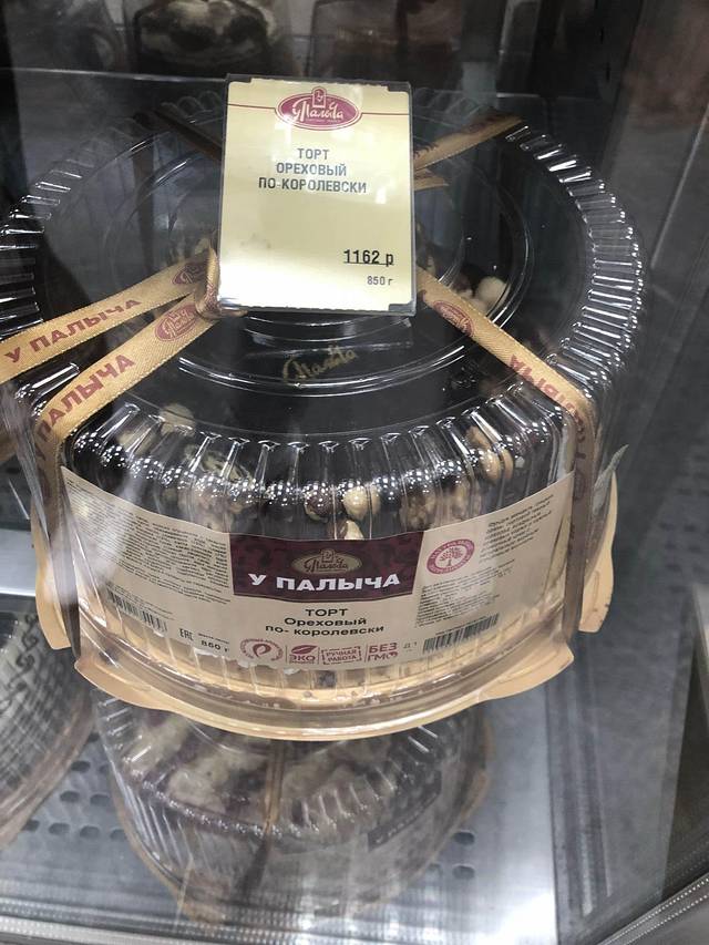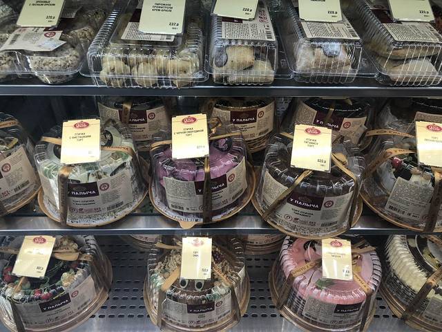 走到另一家食品百货店(很难说是超市,地方不够明亮,像8、90年代的食品百货)。很多精致的蛋糕。6寸的500卢布起(54人民币)。我们最后买了一盒5块切件的蛋糕——甜翻了!