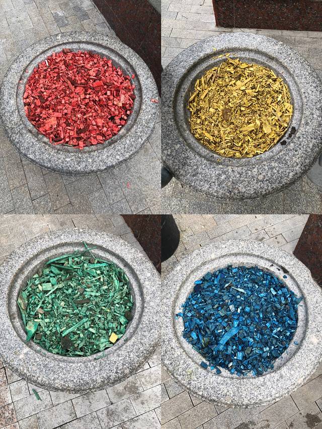 木屑制成的,被染色的,放在0.5m直径的石盆内,不知道是啥功能。