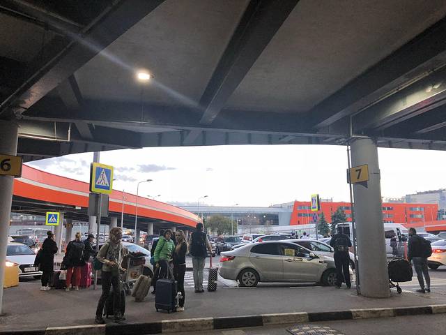 9月29日,从福州的30度——莫斯科5度。在机场外面有数字的立柱旁(图中黄色牌子7),等淘宝包车司机。过关速度不快,但是我们排得前~