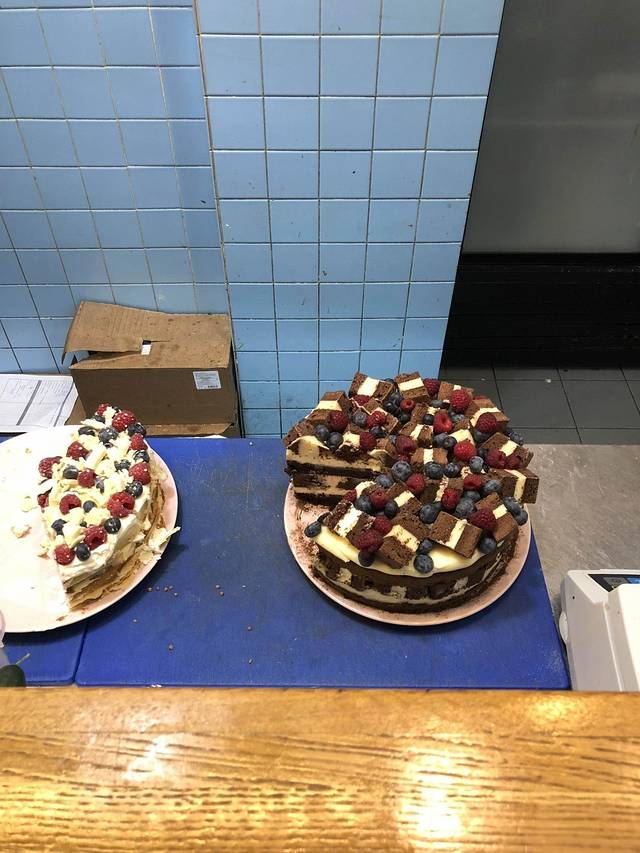 蛋糕看起来都超级好吃!最后点了拿破仑+黑森林泡芙。