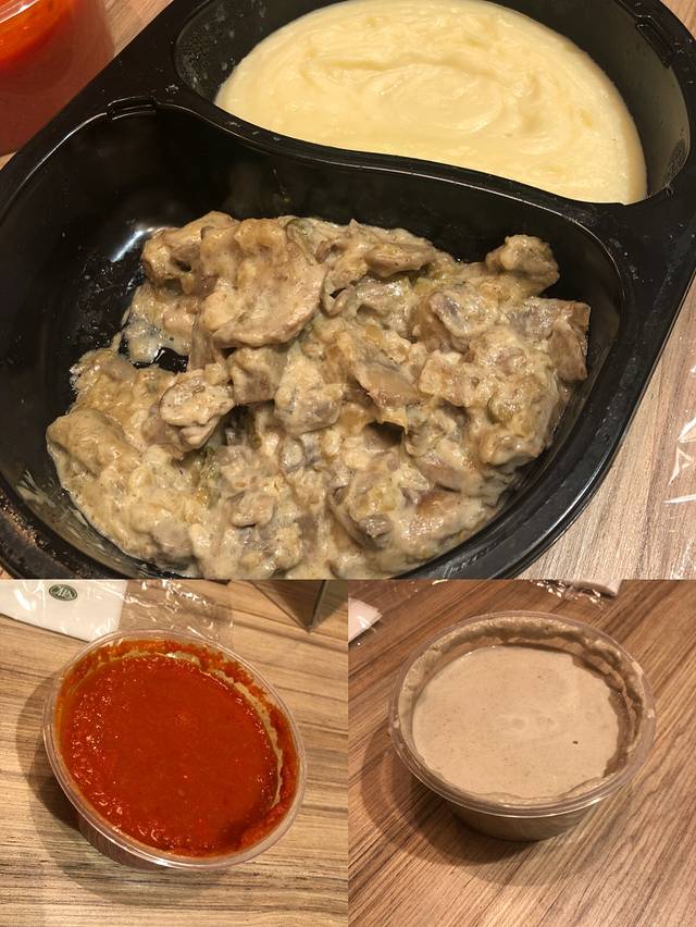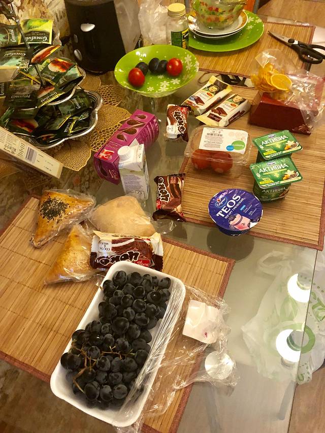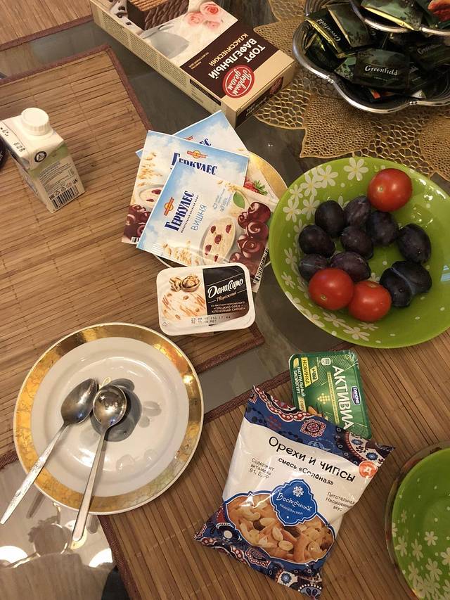 返回到Daily便利吃熟食(现场微波)。有几个没有热透,从上到下从左到右:a-土豆泥+猪肝沙拉,b-酸咸的番茄菜汤,c-奶油蘑菇浓汤。这样3个约800卢布