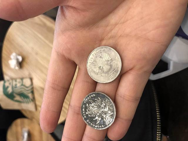 我把人民币1元的当做了他们5元的支付了,服务员提醒了下。
