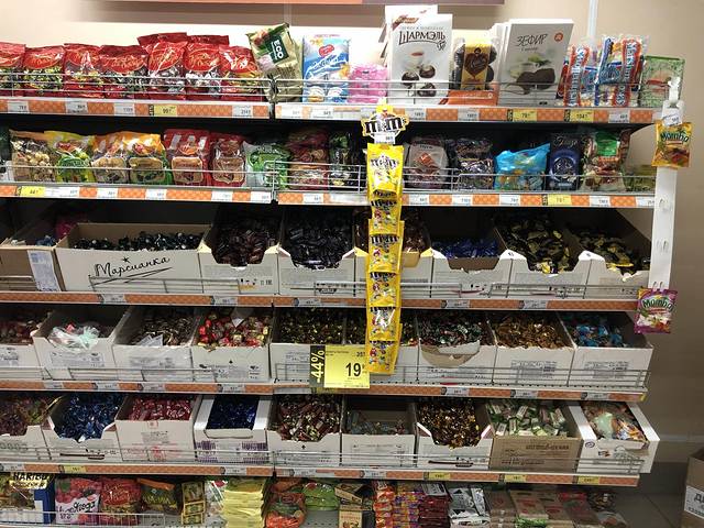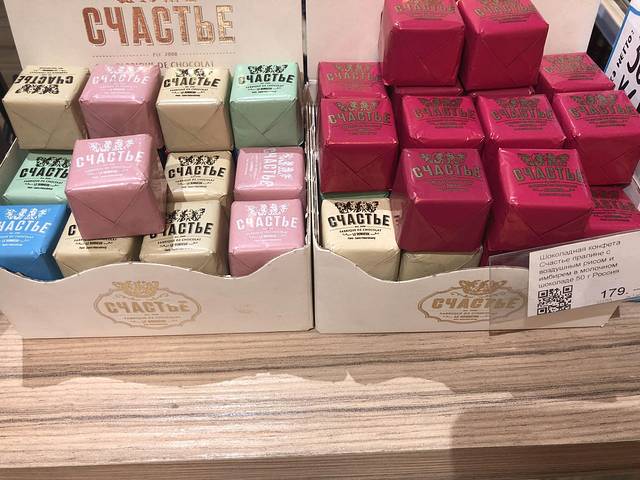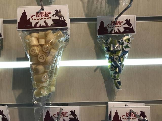 喝汤时,瞄到的边上的糖果。很小一块,如果是巧克力,算是此行中看到比较贵的,因为50g的大头娃娃只要50卢布上下。