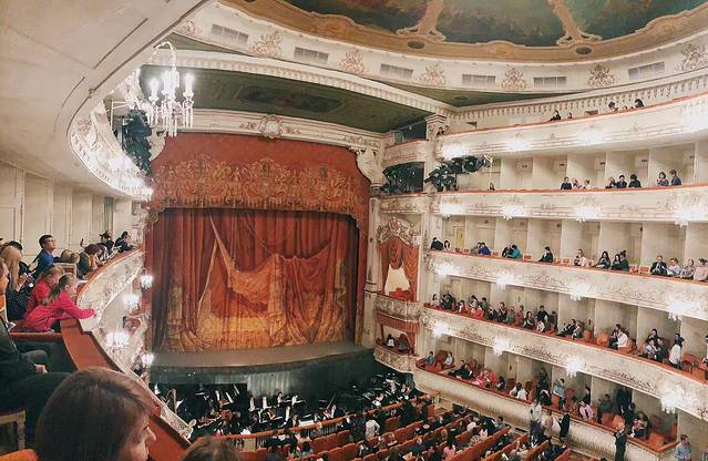 米哈伊罗夫斯基——比较旧了,我们定的位置是3层的2排——于是很容易看到1排的脑袋!