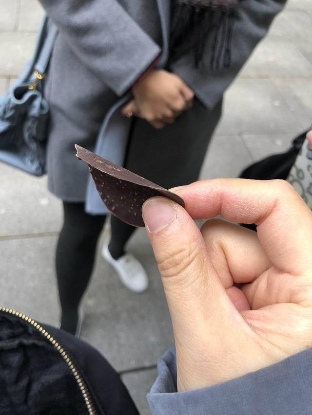 排队时把昨天忘记带了的零食拿出来吃,这个薯片形的,中间带着微小脆香米的巧克力真好吃!