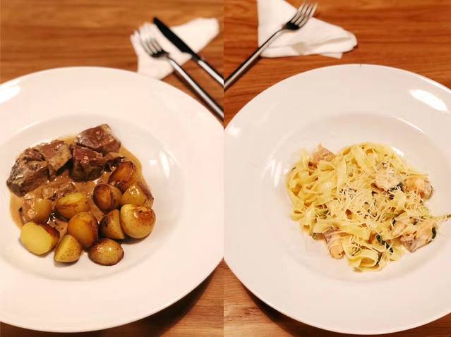 土豆牛肉,土豆有点甜。意面中规中矩。